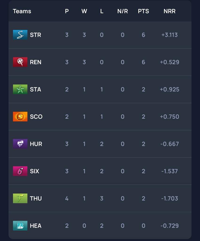 Joe Clarke has scored the lone hundred of the season so far — 101* off 66 vs the Hurricanes — while Nic Maddinson (87 off 49 vs Heat), Aaron Finch (70* off 43 vs Thunder) and Dre Russ (57 off 42 vs Heat) have all had standout individual showings.