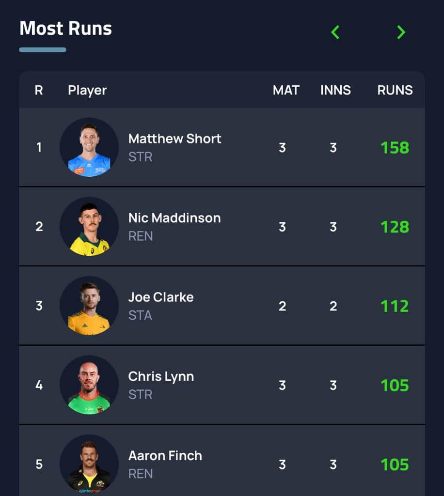Matthew Short has picked it up from where he left off last season. In BBL 2021/22, Short was the third-highest run-getter with 493 runs to his name (at a SR of 155.52). After three rounds, he’s topping the charts with 158 runs at an SR of 146.29.