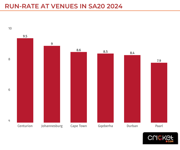 The SA20 matches have been played across six venues and barring Boland Park, the home venue of the Paarl Royals, the average run rate at every venue is well above 8. The Super Sport Park in Centurion and the New Wanderers in Johannesburg have an average run rate of 9.5 and 9 respectively.