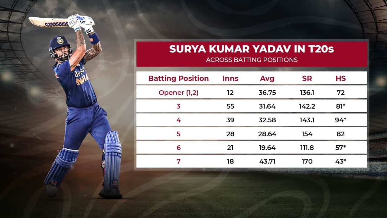 In his short T20I career, Suryakumar has batted in three different positions in the middle-order (No.3, No.4, No.5) and has excelled everywhere, seamlessly adjusting to the needs and demands of each position.