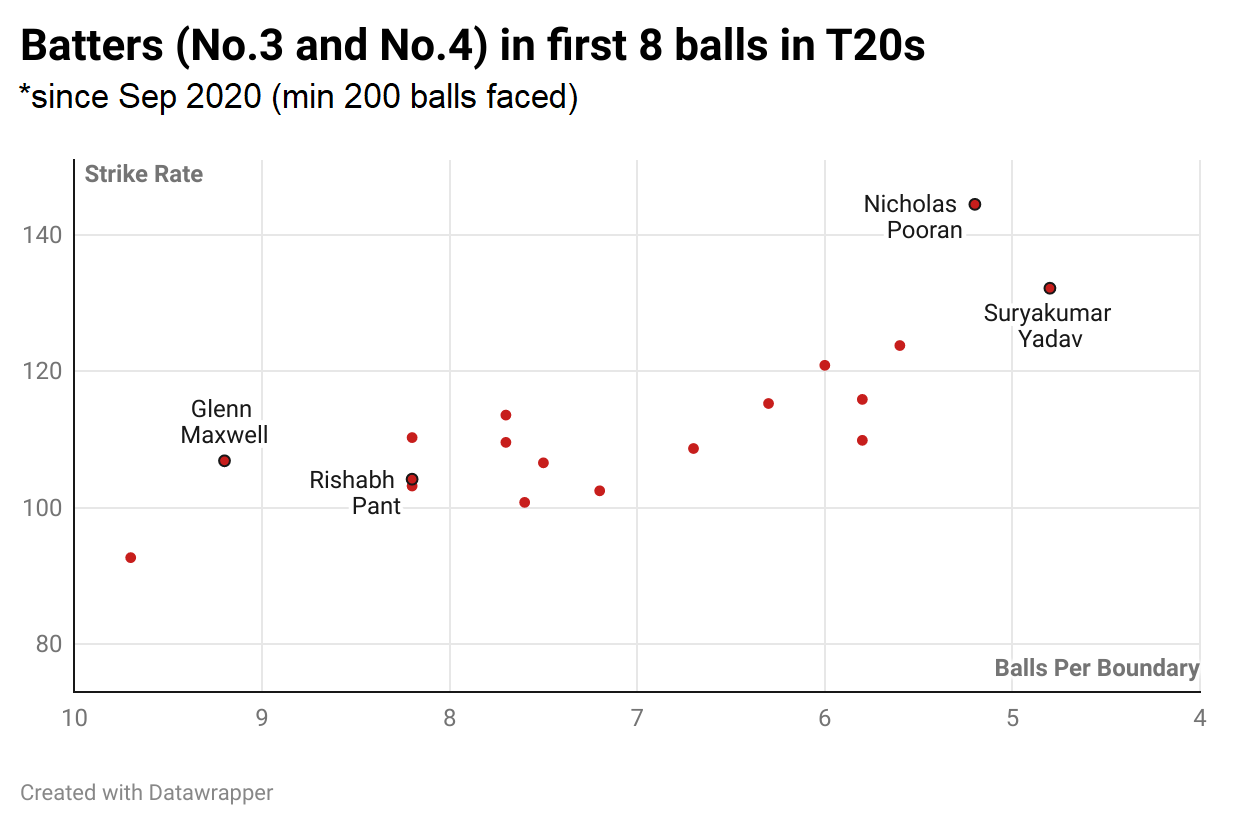 Since September 2020, among No.3 and No.4 batters, only Nicholas Pooran (144.5) has scored quicker in the first 8 balls than Suryakumar (132.2). However, in this time period, no batter in the world has struck a boundary as frequently as SKY (once 4.8 balls) in the first 8 balls of their innings.