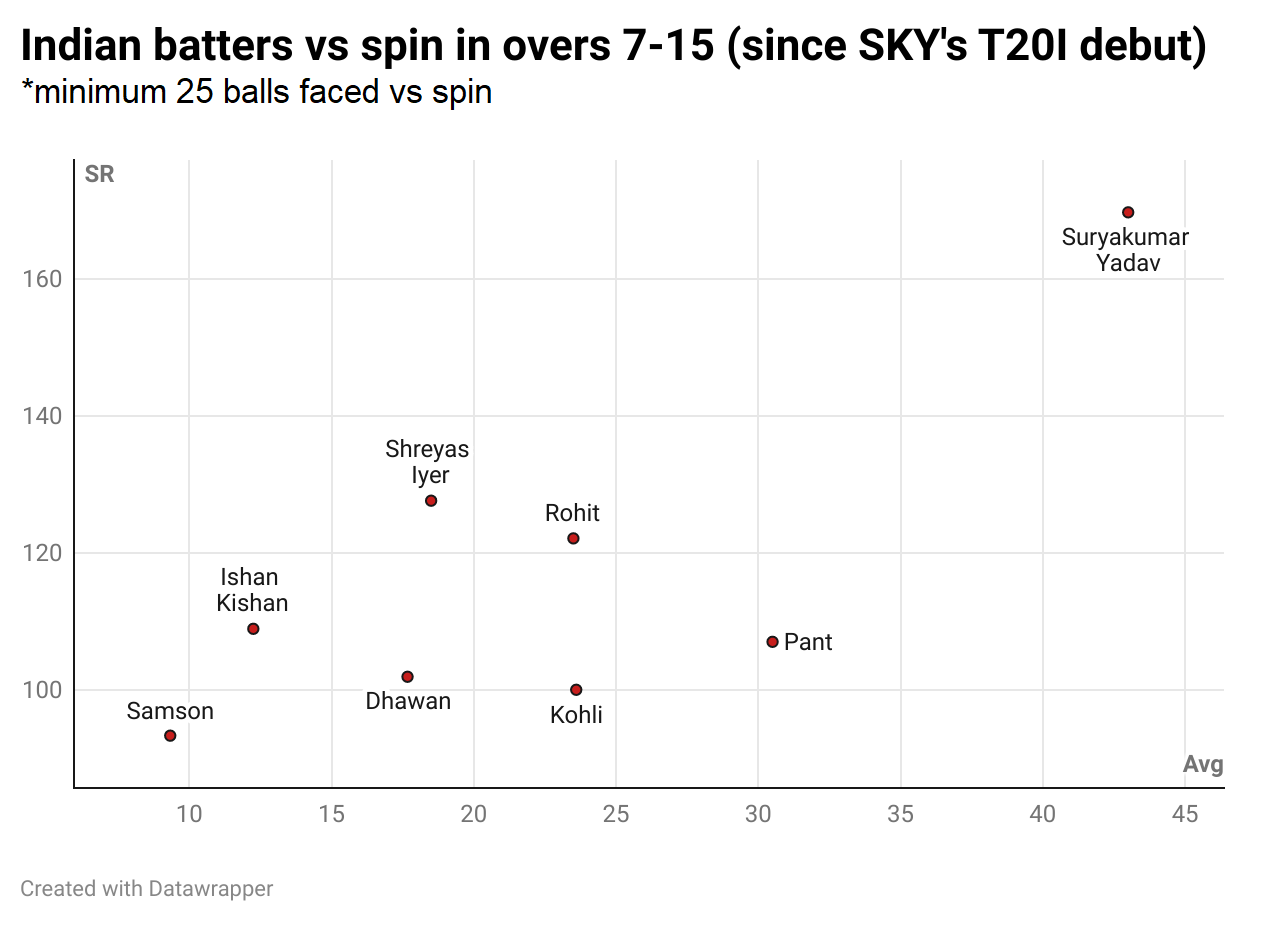 What makes Suryakumar an indispensable asset in this Indian line-up is his ability to handle spin in the middle overs. Since SKY’s T20I debut, he’s averaged 43 and has struck at nearly 170 against the spinners in overs 7-15. No other batter has come close to putting up such figures in this period.