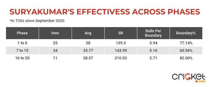 Since September 2020, Suryakumar has been equally impactful and effective in all phases, with his strike rate being a clear stand-out.