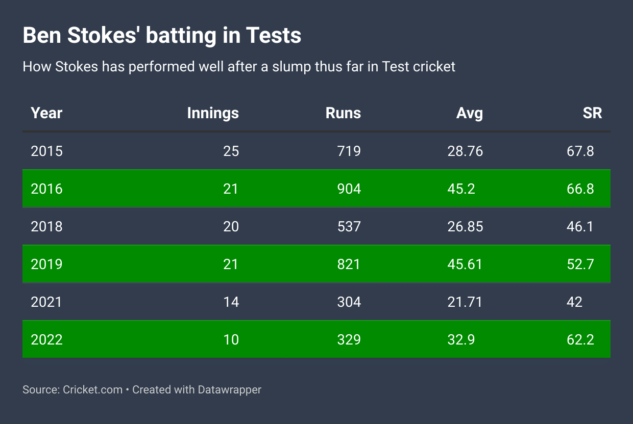 Interestingly, though, there was a theme that surrounded Stokes’ career before he donned that armband. If you look closely at his career, there were definitely some lows—2015, 2018, 2021—but what surrounded those lows were some of the best highs.