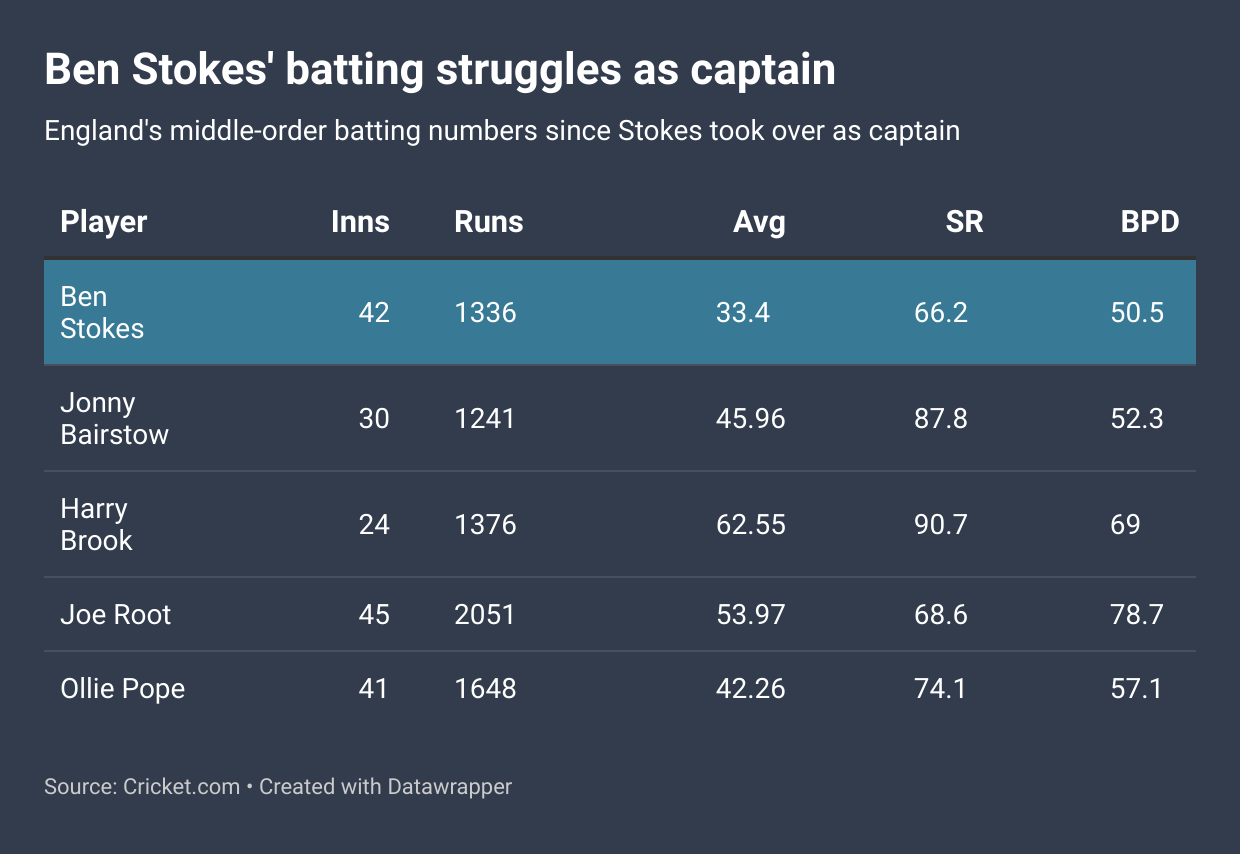 Pre-captaincy, Stokes averaged 35.77 with the bat while still striking at 57.5.