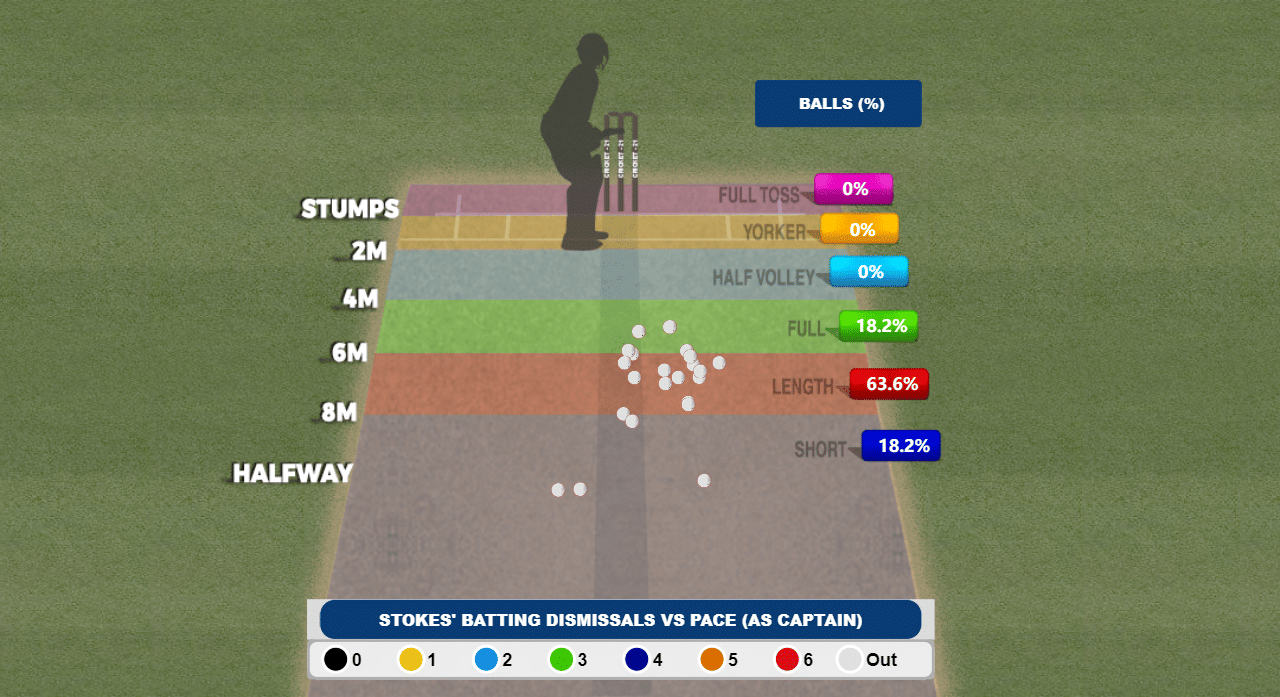 There isn’t a more evident pattern in Stokes’ dismissals than the balls hitting the stumps. 17 out of the 27 recorded dismissals show that you target the stumps, you have a very good chance of dismissing the English skipper.