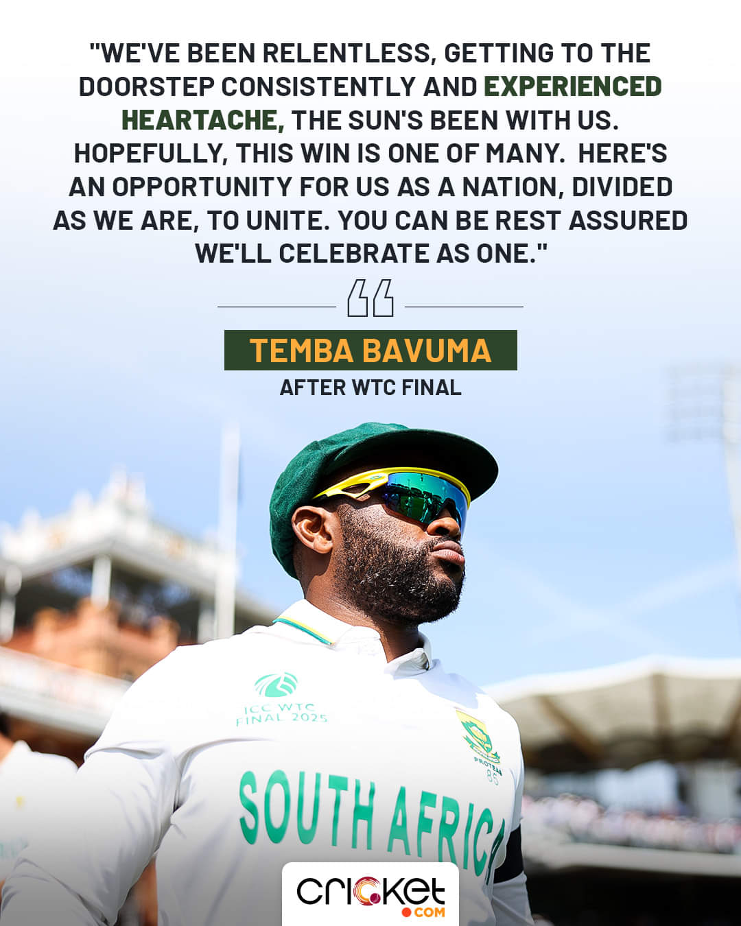 And still, Bavuma knew that this victory was of more than just the 11 who bowled, batted and fielded. It was the win of a nation that had defied history to reach there. Bavuma understood the symbolism of him, a Black man, being the first South African skipper to win a major world title in cricket. He understood how his entire existence defies stereotypes, as despite Black batters being rare in South African cricket, he became one of their best on merit and then led them to a glory they could never achieve before him.
