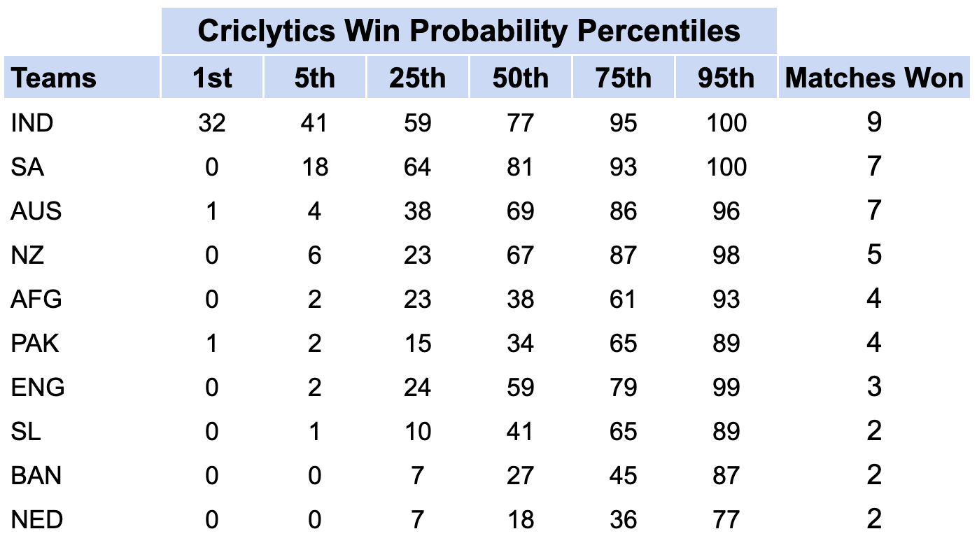 Moving on to the four teams that qualified for the semis, we observe that all of them had medians (50th percentile rank) exceeding 65%. This means that more often than not their chances of winning have been more than 65%. South Africa led the way with a median of 81%, while England had the highest median (59%) among teams that didn't advance to the semis. Despite this, England failed to translate their probability of winning into actual victories. Since the past performance data is also considered in this, it explains how much of an underperformance it was from England.