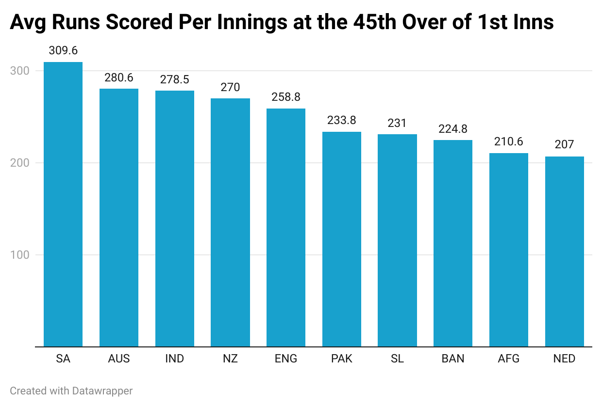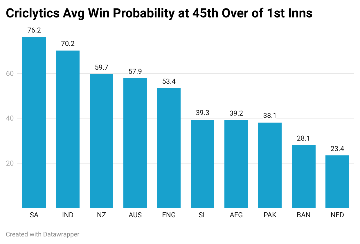 To better understand what contributes to teams maintaining a high Criclytics Win probability, we looked at the average number of runs scored per innings at the 45th over when batting first. Unsurprisingly, all the semi-finalist teams occupy the top spots in this category, with South Africa leading the way with an average of 309.6 runs, closely followed by Australia, India, and New Zealand with averages of 280.6, 278.5, and 270.0 runs, respectively.