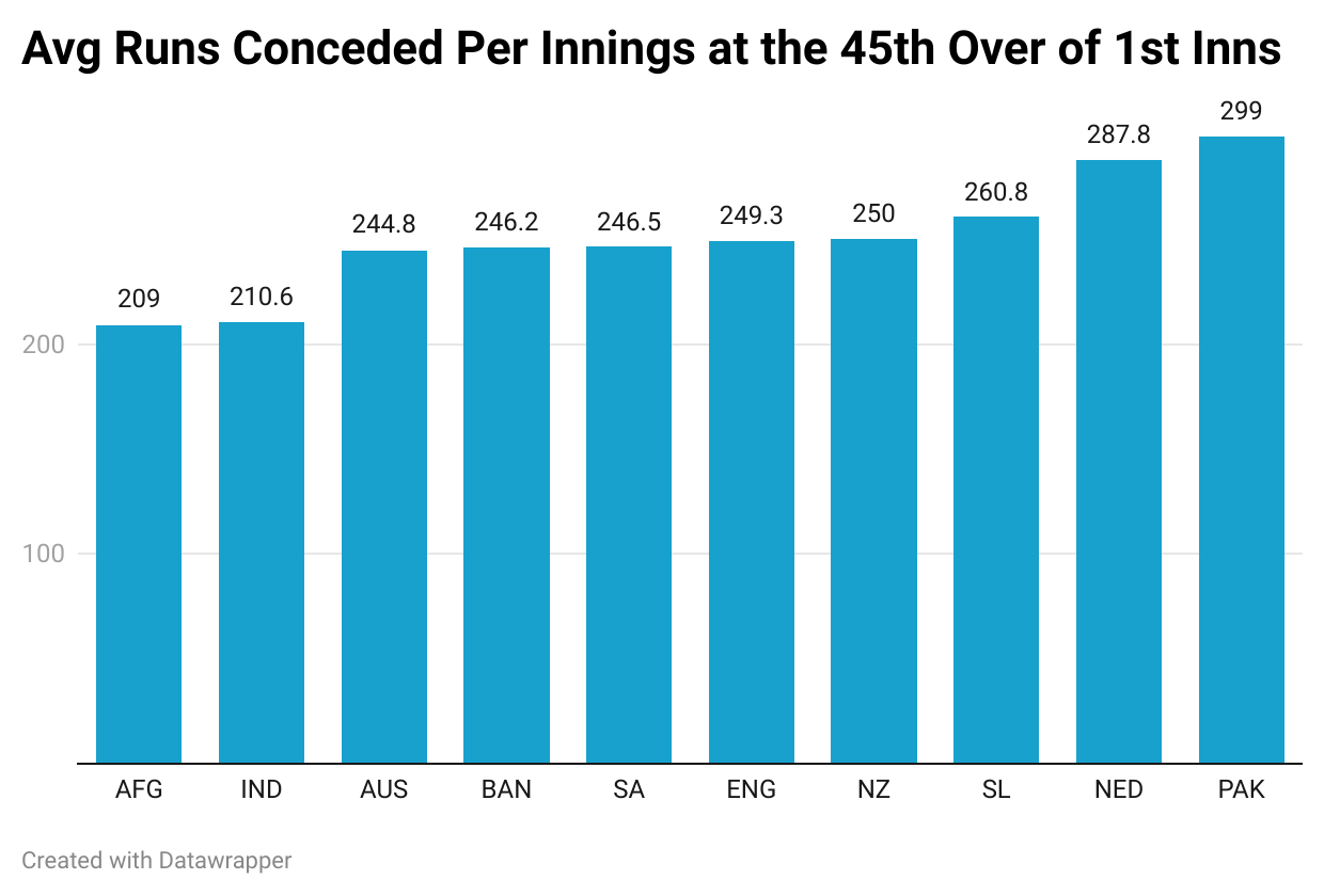 However, when examining the teams' performances when bowling first, we see that India and Australia rank among the top two in terms of average runs conceded per innings at the 45th over, with 210.6 and 244.8 runs, respectively. Afghanistan leads this list with an average of 209 runs, while the middle three teams show less variation in their ranges, ranging from Australia to New Zealand with values between 244.8 and 250.