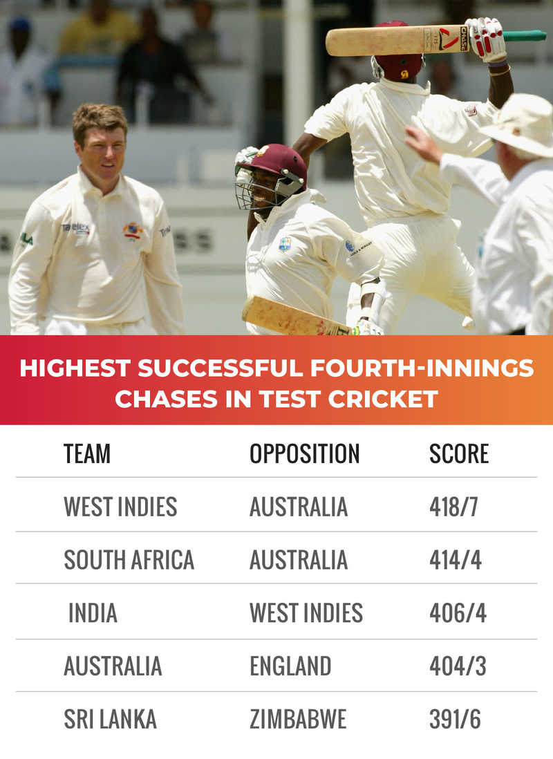 The target that huge had never been successfully overhauled in the fourth innings of a Test and with the hosts already trailing 3-0 in the series, few would have given them a chance. Things became tougher when Lee, Jason Gillespie and Glenn McGrath struck once each to get rid of the top three West Indies batsmen with the score on 74.