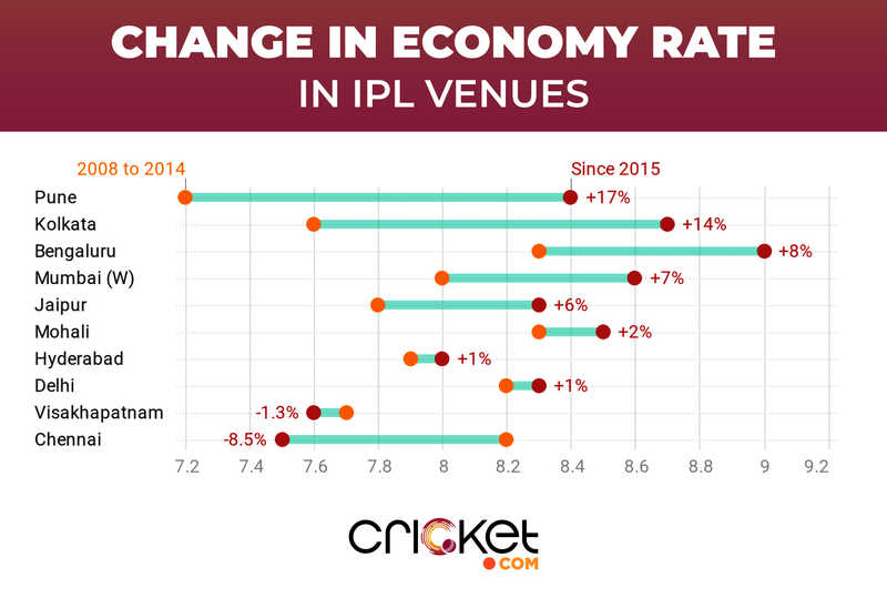 Chepauk has consistently been one of the venues in which bowlers rejoice and it gets troublesome for the batsmen due to its slow nature as the game advances. Thus, the economy here is the lowest among all the venues with a minimum of 10 IPL matches since 2015. The scarcity of runs scored has a direct impact on the bowling average as well.
