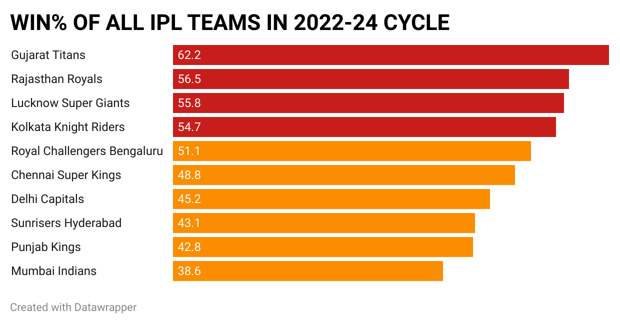 The trend followed in this mega auction as well. Gujarat Titans, Rajasthan Royals, Lucknow Super Giants and Kolkata Knight Riders had the best win percentage between 2022-24, and all the sides have lost a chunk of their strength while re-framing their squads for the upcoming cycle.