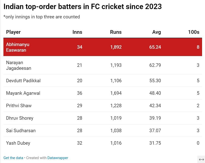 Easwaran has been smashing the door down the same way Mayank Agarwal did five years back. He’s scored four hundreds in his last six red-ball innings and, since February 2024, is averaging 99.1, having scored 991 runs in 13 innings. Crucially, he’s scored big runs in every single competition he’s played, averaging over 75 in all three of Ranji Trophy, Duleep Trophy and Irani Trophy.