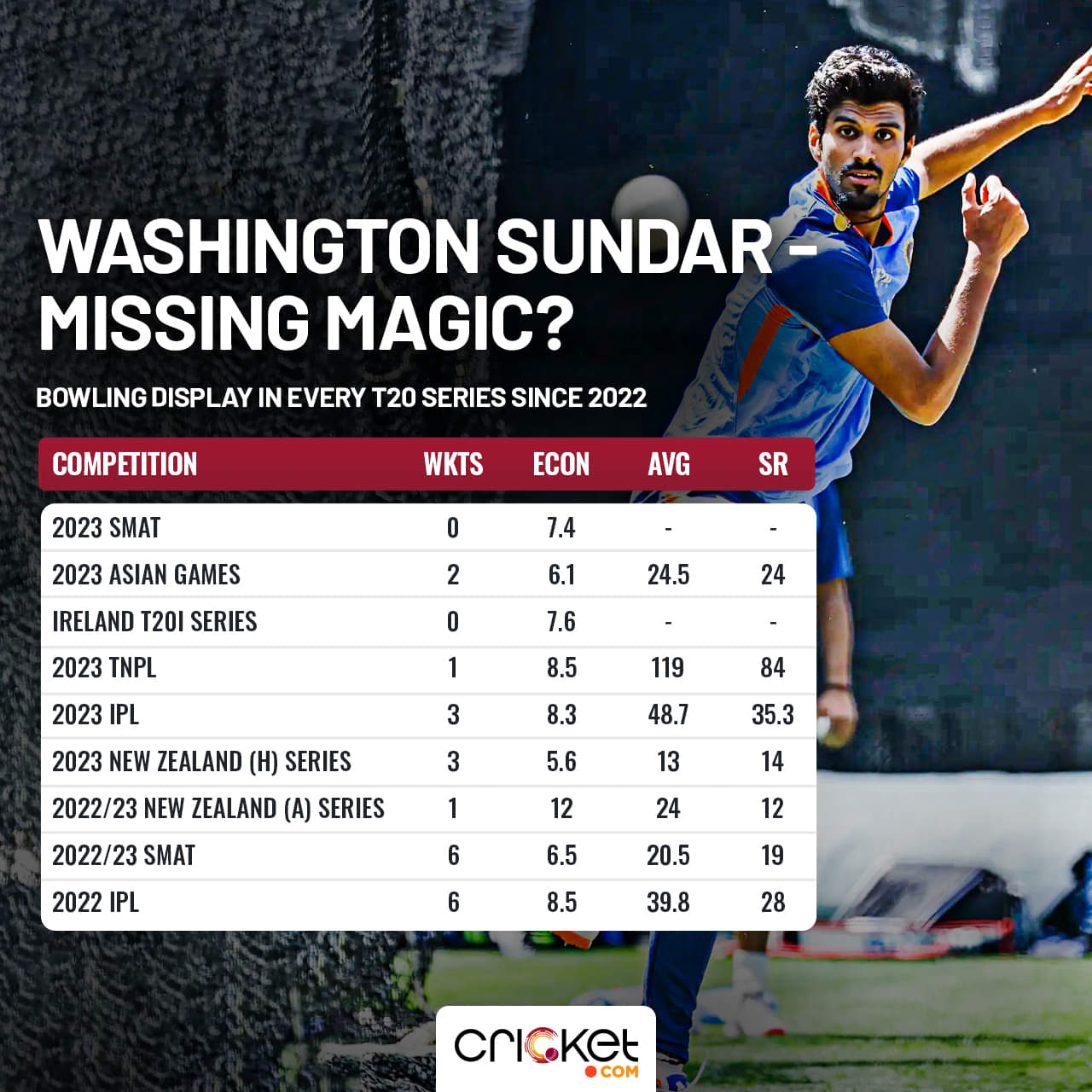 At the Indian Premier League (IPL) level, the numbers further take a tumble. Neither was his batting fluent, with an average of 14.64 and a strike-rate of 124.8, nor was his bowling with nine wickets, giving runs away at 8.4 an over. It gets worse at the 2023 Syed Mushtaq Ali Trophy (SMAT), where Washington went wicketless, conceding runs at 7.35 an over, having bowled 17 overs.