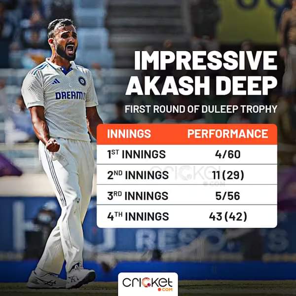 Why? In his last first-class appearance, Akash Deep was a menace for the batters, running through a talented India B outfit, picking up four wickets in the first innings, and conceding just 60 runs. Amongst his victims were Rishabh Pant, Nitish Kumar Reddy, Navdeep Saini and Yash Dayal.