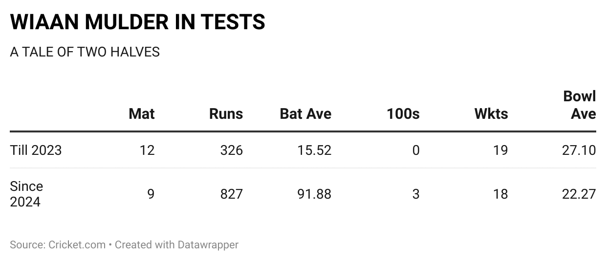 While the triple century is certainly special, what it's done is further vindicate the faith shown in Mulder's potential by the South African management. Since 2024, Mulder has three centuries and a fifty in 13 innings, averaging over 90 in this period.