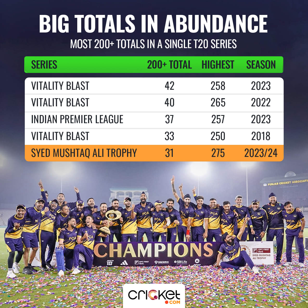 In 131 matches, there were 31 totals of over 200, with Punjab’s 275 against Andhra in Ranchi being the highest. No other season has seen more than 20 totals - 18 in the 2018/19 edition was the most. Only in four other T20 tournaments, including the 2023 IPL, were there 30+ totals of 200 or above.