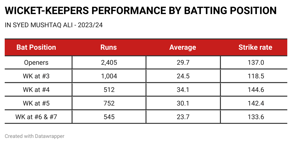 The keepers who opened the innings were among the runs, but the ones who batted at number four and five were the most beneficial. Keepers at number four averaged 34.1 with a strike rate of 144.6, the best among wicket-keepers at other positions.