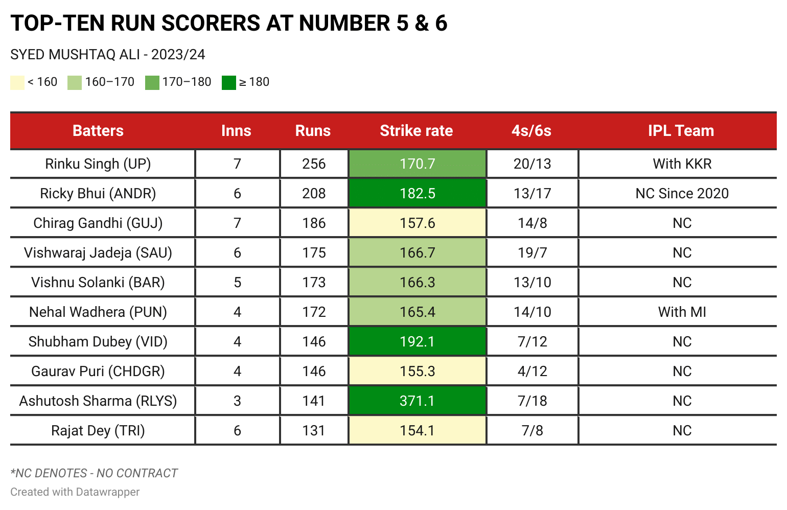 Power-hitting batters at number five and six in India are scarce. However, this season of SMAT produced them in abundance. Overall, the number five and six batters scored over 7500 runs at a superb strike rate of 132.8. In none of the other seasons with 20+ matches, the batters in these positions had a cumulative strike rate of 125+.