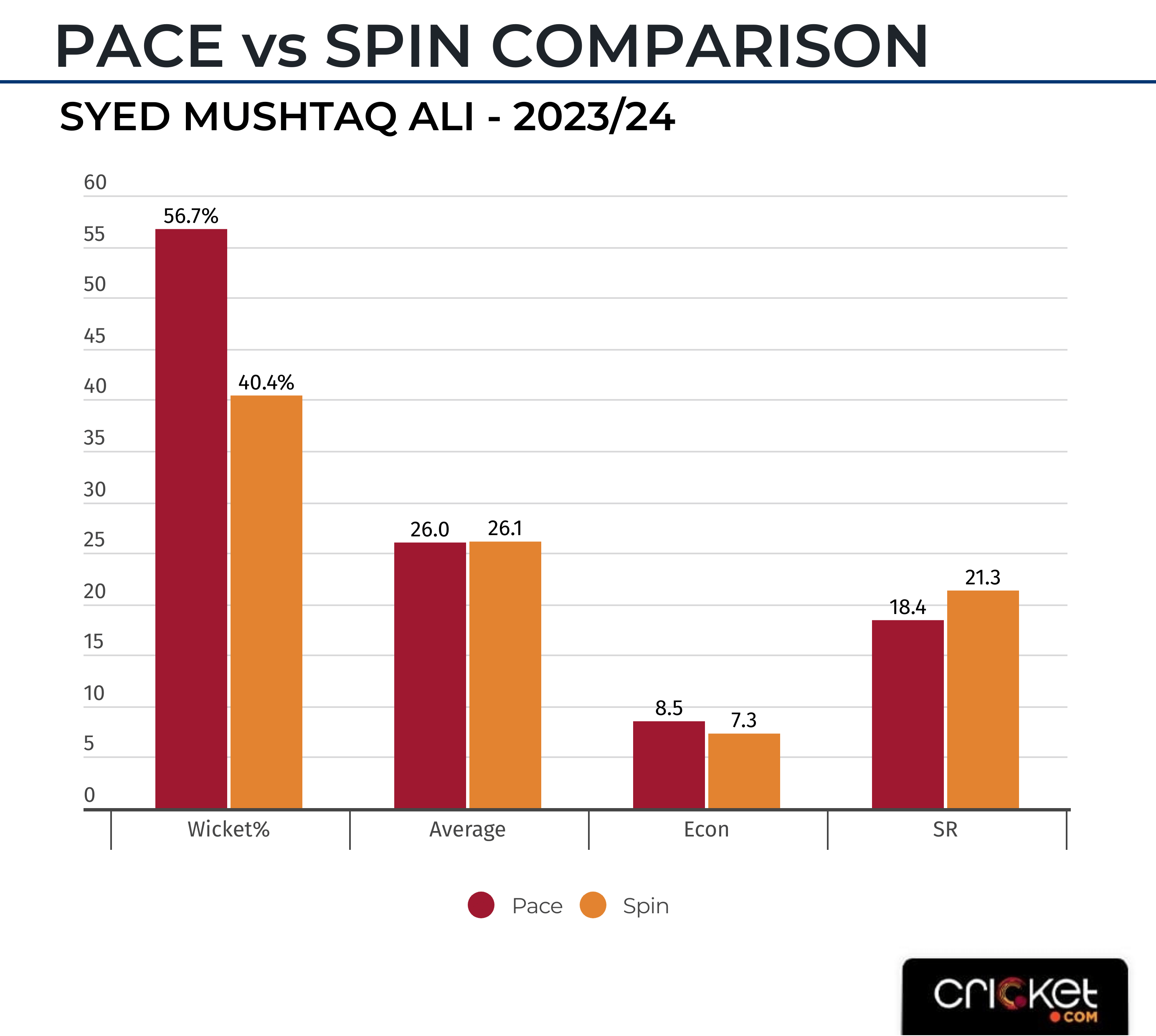In the split, spinners were way more economical than the quicks. While the tweakers conceded runs at 7.3, the pacers conceded at 8.5. In an edition of SMAT with 20+ matches, this was the only season in which the seamers conceded above eight runs an over.