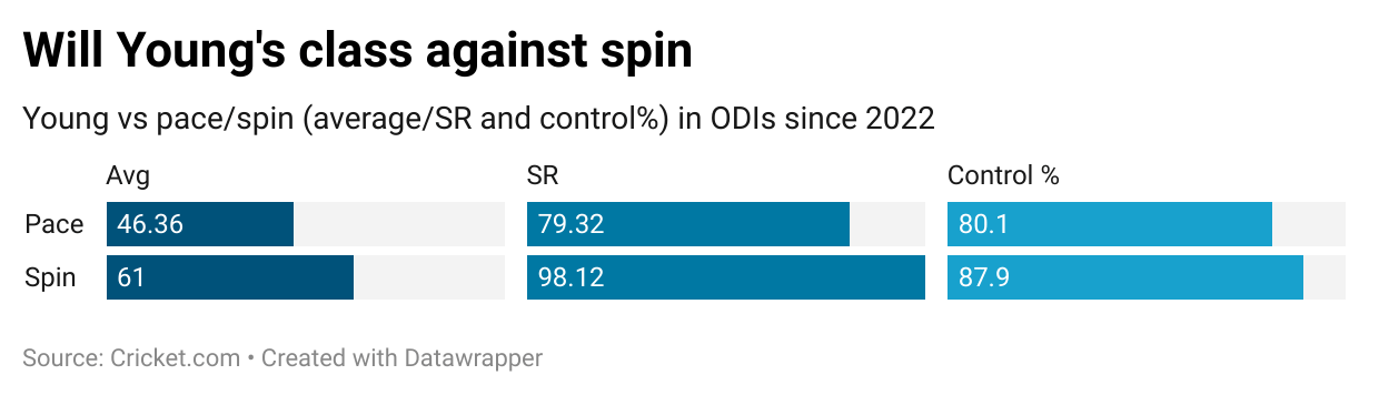 Rahmanullah Gurbaz is a key batter for Afghanistan, as witnessed in their previous clash against England, where he scored a scintillating 80. There is one bowling type - left-arm orthodox - against whom the right-hander struggles. He’s gotten out four times, averaging only 20 with a strike-rate of 65. New Zealand have two left-arm spinners - Mitchell Santner and Rachin Ravindra.