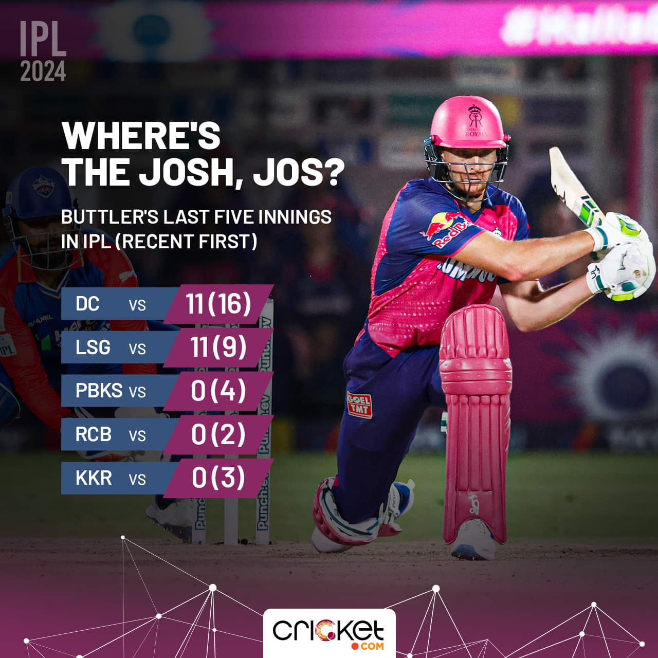 It’s not often that Jos Buttler’s form comes under the scanner, but the England skipper has been going through a torrid run in the IPL. He’s begun this season with scores of 11 & 11, but, dating back to last season, he’s managed a solitary fifty across his last 12 innings in the competition. During this period, he’s averaged 17.5 while having struck at 112.3.