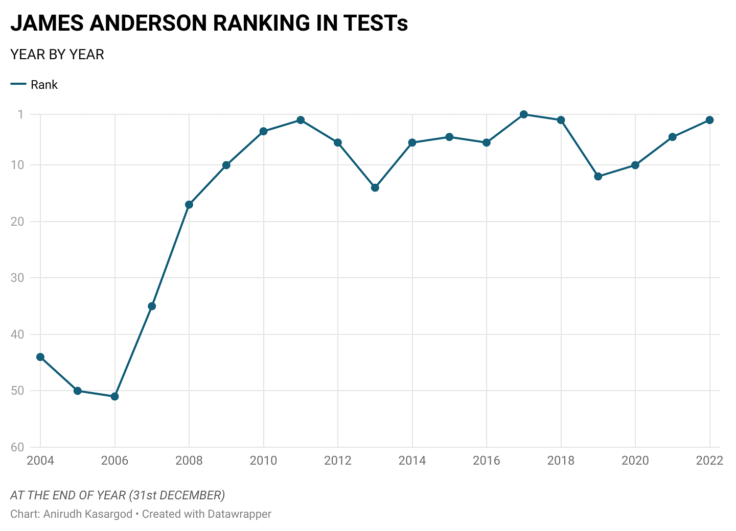 Once again, in 2019, his ranking saw a dip. As has been the case in most of his Test career, he raised once again. At the end of 2021, Anderson was the fifth ranked bowler and in 2022, he was the second ranked bowler. With a stellar performance in the first Test against New Zealand this year, he is now the number one bowler.