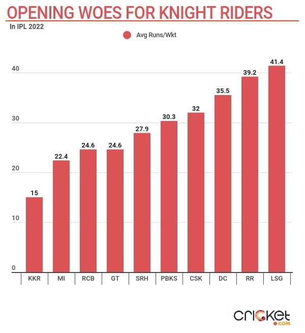 The opening partnership of Knight Riders have scored 285 runs at a strike rate of 108.4 and have an average of 15 runs per wicket, which is the worst among all the teams in the competition.