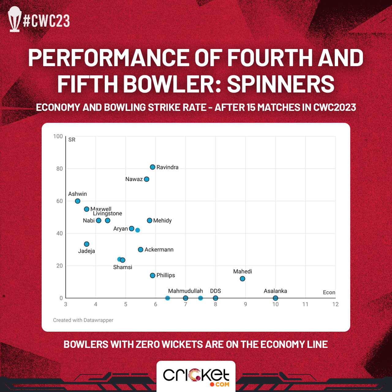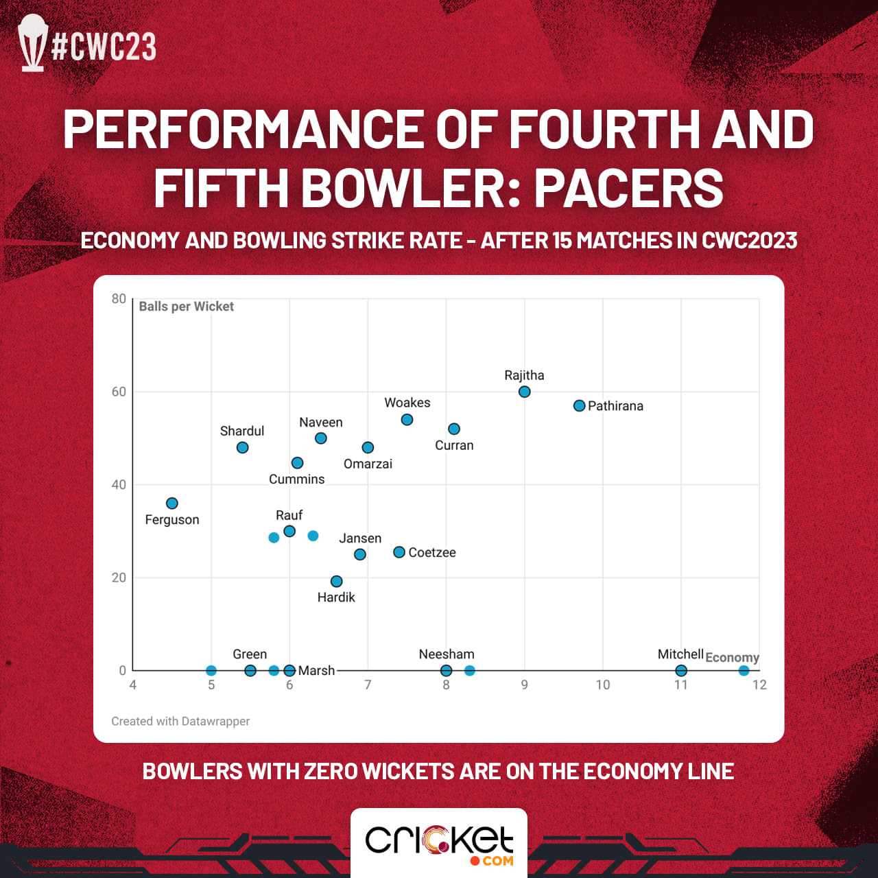 Glenn Maxwell’s economy has been the same as Jadeja's. He has been the frontline spinner for Australia for all practical purposes. He has single-handedly ensured that Australia’s support bowlers have kept things tight. However, the lack of wickets in the 20 or so overs by the support bowlers has influenced Australia’s results. Green, Stoinis, and Marsh have been wicketless so far, while skipper Pat Cummins has had only one good game against Sri Lanka.