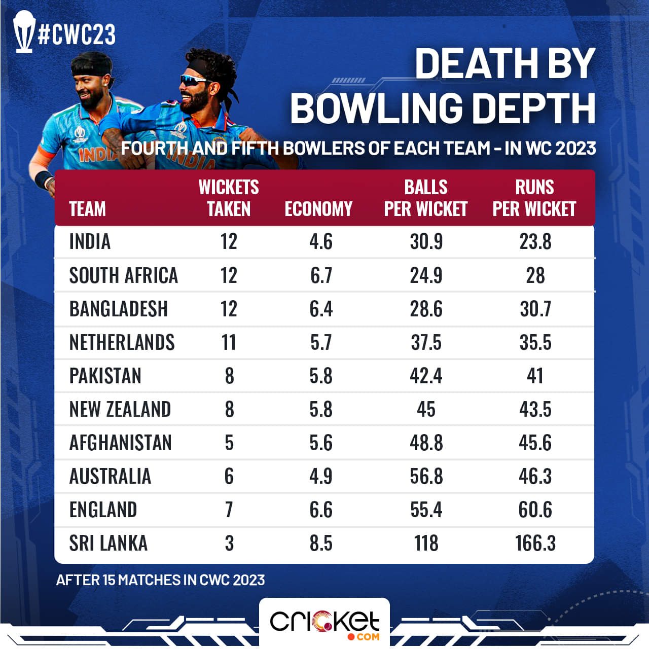 New Zealand have used five bowlers for the fourth and fifth bowler’s quota. Same as England and the Netherlands. The better Lockie Ferguson has turned up so far both on wicket-taking ability and economy. Glenn Phillips has been a surprise giant-killer with wickets of Joe Root, Moeen Ali, and Nazmul Hossain Shanto. Rachin Ravindra has had an economy of 5.9 and has picked only two wickets in three games. James Neesham’s bowling average since the last World Cup is now touching 300. All this put together have translated into middling returns for New Zealand’s support bowling group.