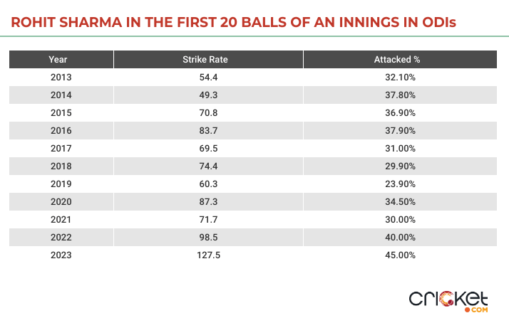 However, since the start of last year, things seem to have taken a curious turn. Across his last 10 ODI innings, Rohit has been striking at 105.3 in his first 20 balls. And no, these numbers have not been skewed by a couple of innings — in 8 of these 10 innings, he’s struck at over 85.00 in his first 20 balls.