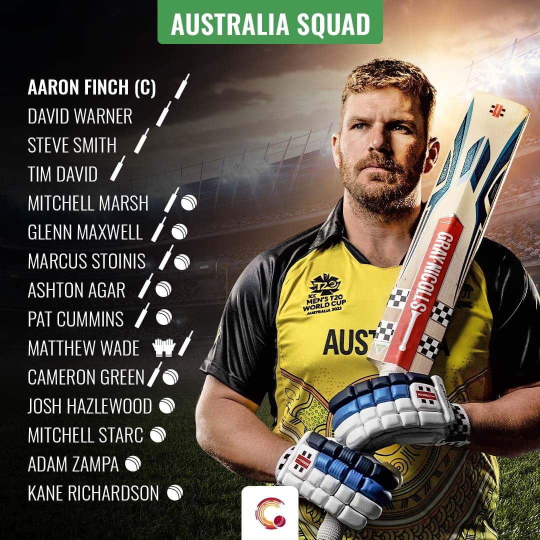 David Warner, Aaron Finch (c), Mitchell Marsh, Glenn Maxwell, Marcus Stoinis, Tim David, Matthew Wade (wk), Pat Cummins, Mitchell Starc, Adam Zampa, Josh Hazlewood