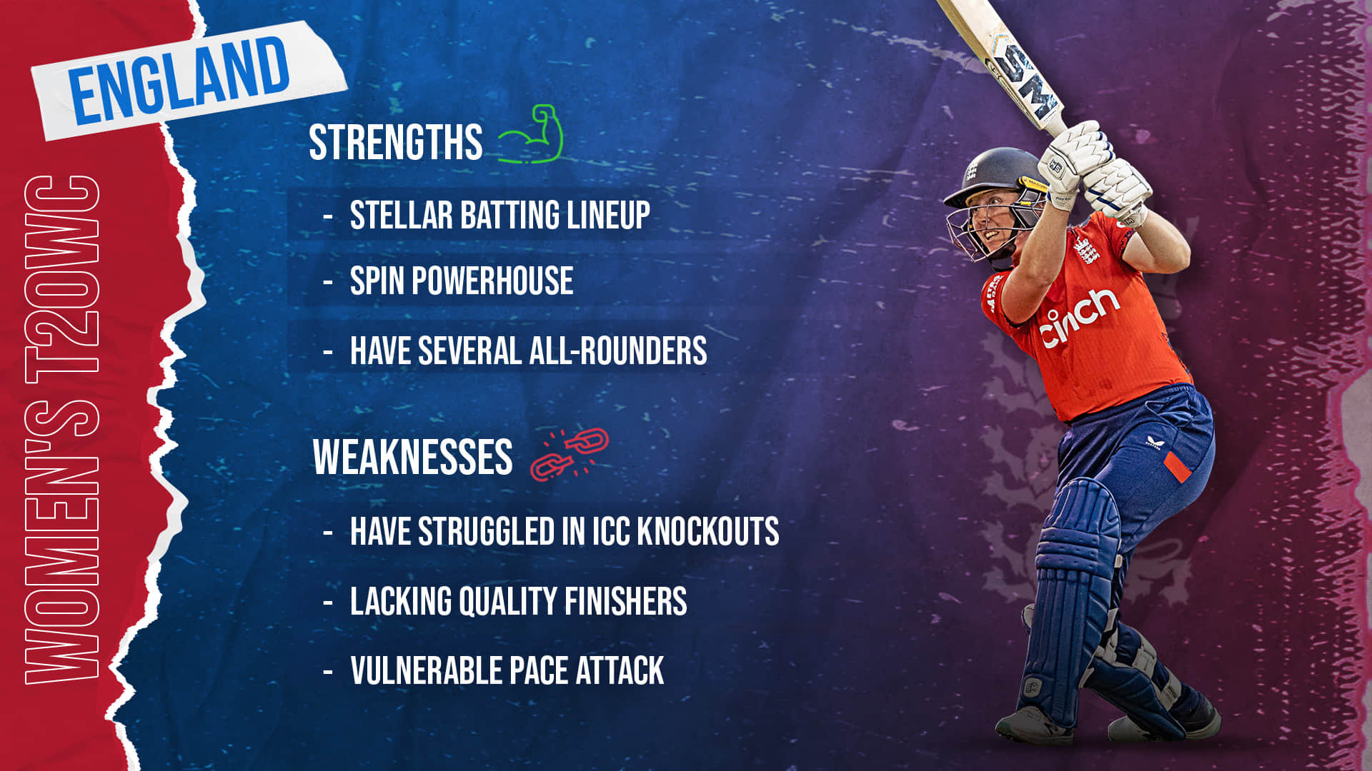 Danny Wyatt, Maia Bouchier at the opening slot, followed by Alice Capsey, Nat Sciver-Brunt, Heather Knight and Amy Jones makes England one of the most dangerous batting units. There is not only firepower, but a lot of form as well, with Knight being in supreme touch from the Hundred. Jones has blown hot and cold off late and therefore finishing can be a problem for England down the order.
