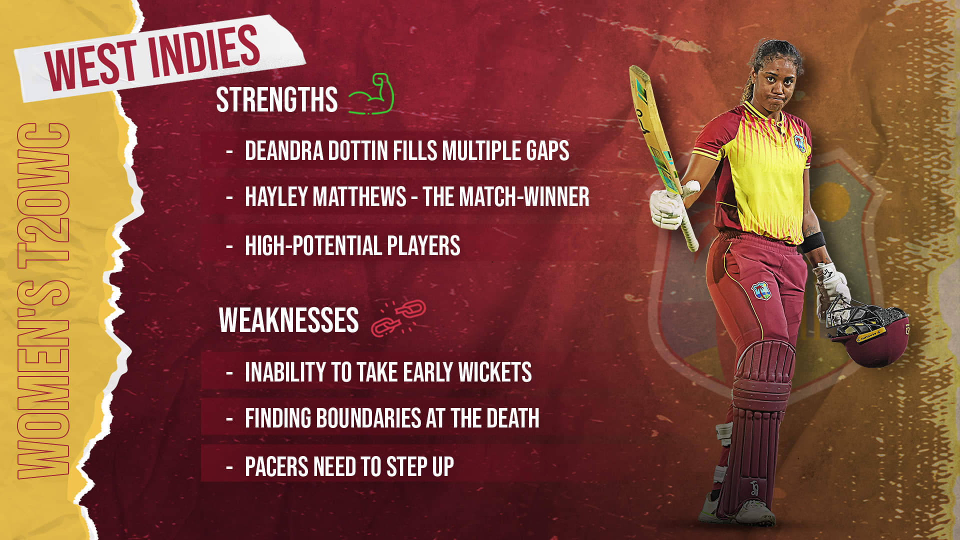 The only other team apart from England and Australia to win a Women’s T20 World Cup, West Indies have been on a downward trajectory since then. Despite the likes of Hayley Matthews and Deandra Dottin in their side, they might struggle to challenge South Africa and England.