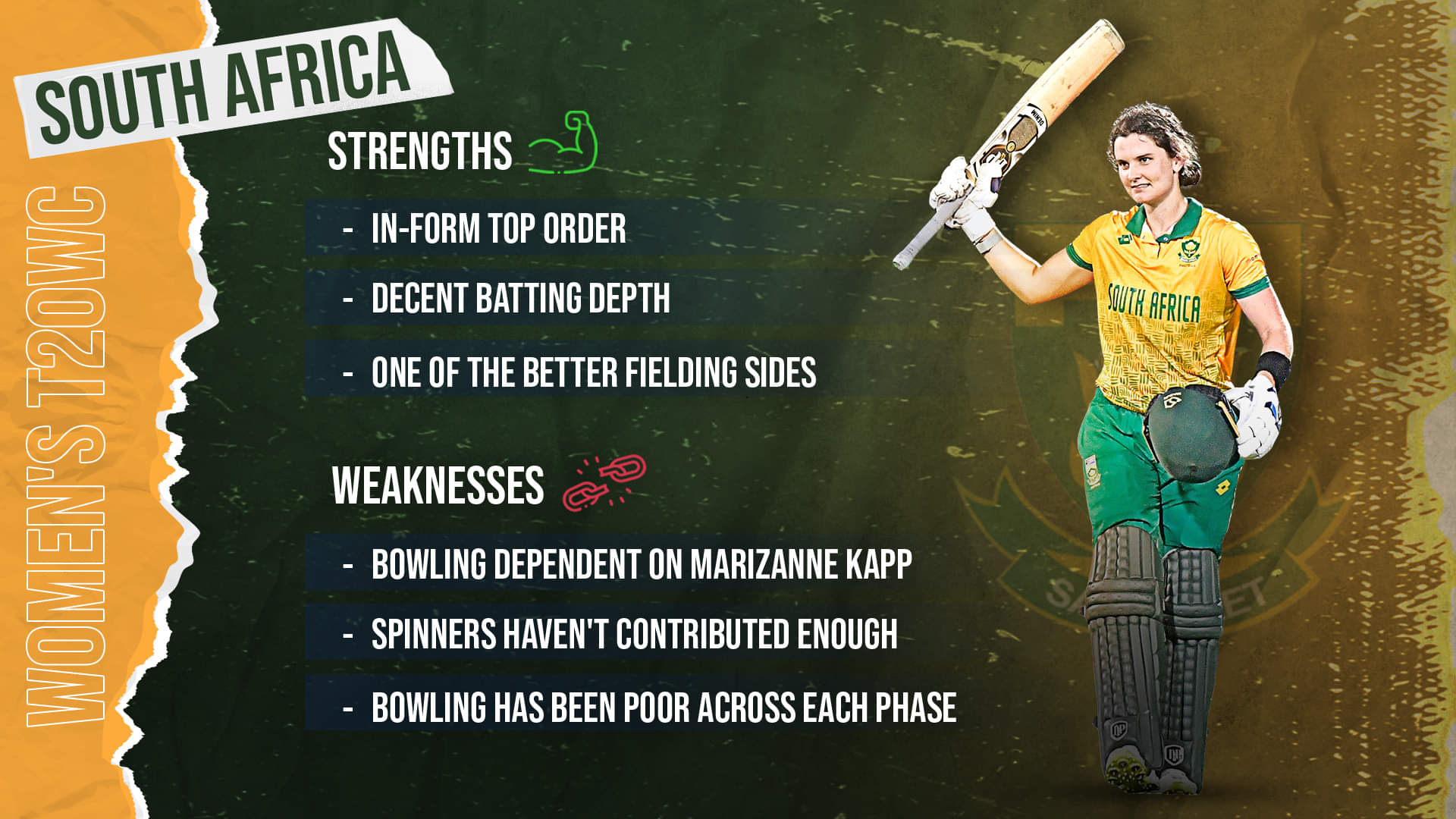 The reasons are clear. Apart from Nonkululeko Mlaba, they don’t have striking spin option strong enough to trouble the opposition teams which will all come well-prepared for spin. Seshnie Naidu, the leg spinner, is a good addition to the squad and might prove a point of difference. However, the bowling attack would once again look desperately at Marizanne Kapp and Ayabonga Khaka to get them some wickets.