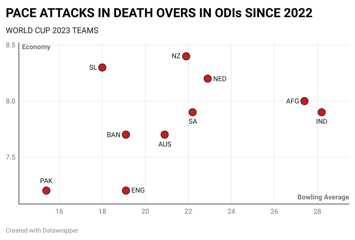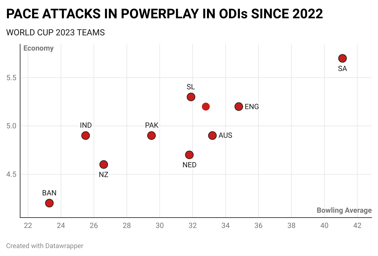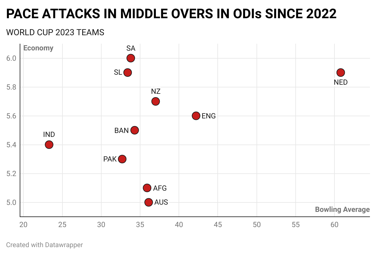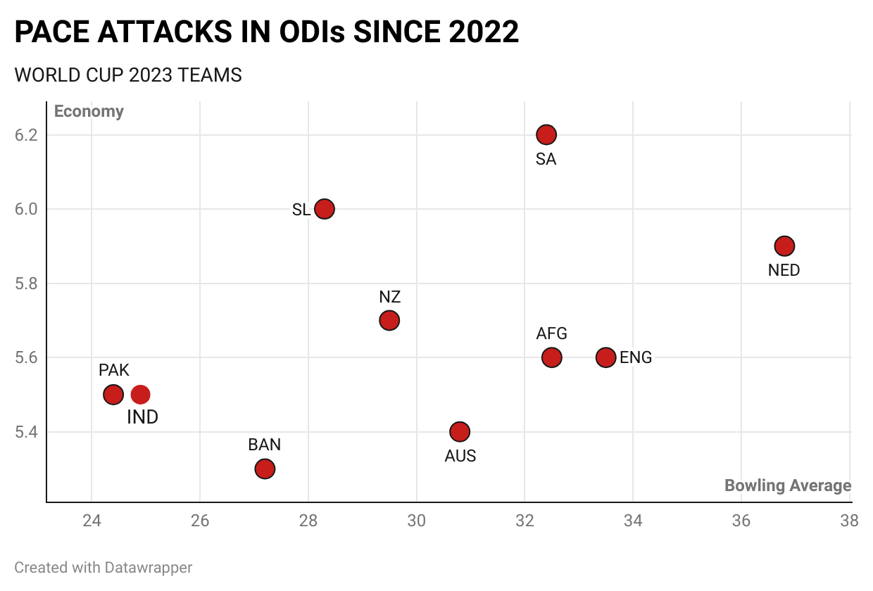 Australia would like to pick more wickets alongside being economical. They have great numbers at home (average 18.9, economy 4.2) but have struggled away (average 38.7, economy 5.9). With Pat Cummins, Josh Hazlewood and Mitchell Starc set to play their third ODI World Cup in a row, the five-time champions have the most experienced pace trio. They have played only one ODI together since 2022 but will reunite for this showpiece event.