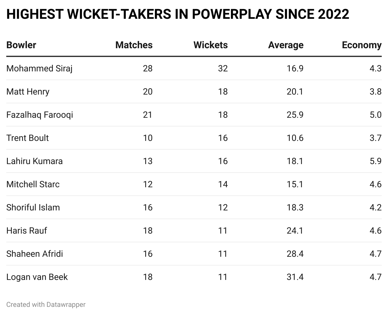 England and South Africa are the other sides with plenty of catching up to do. Sam Curran is the only seamer on both sides to average under 30 (minimum five powerplay wickets since 2022). Chris Woakes (34.2), Reece Topley (32.1), David Willey (43.3), Marco Jansen (53.6), and Kagiso Rabada (41.6), all have underwhelming averages despite being good swing bowlers.
