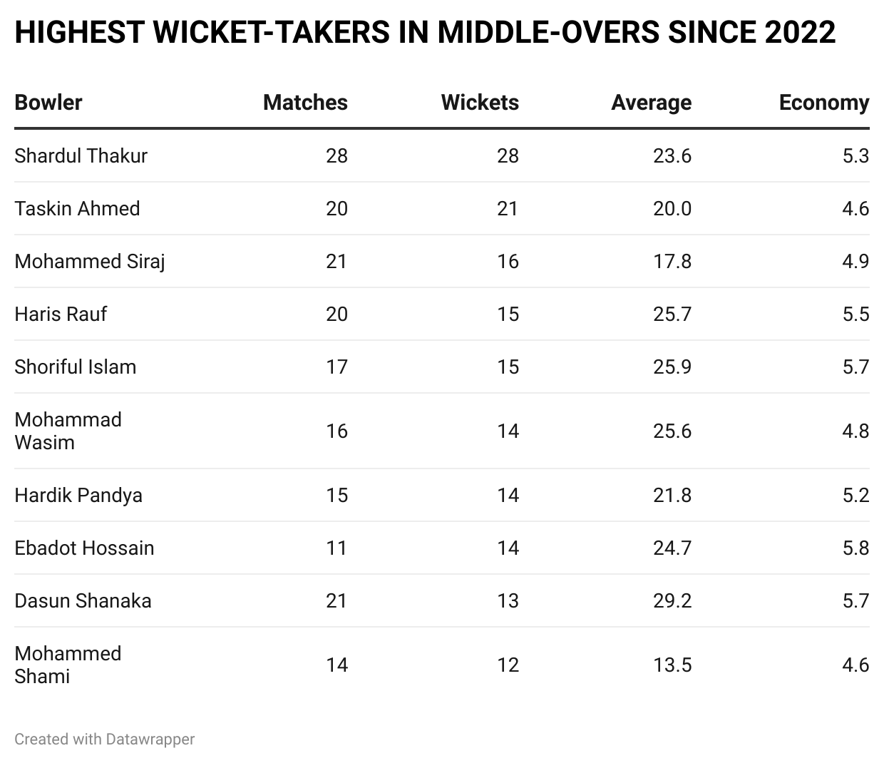 Taskin Ahmed is a bonafide wicket-taker with 21 wickets in the middle-overs. His average dips from 43.2 in the powerplay to 20 in this phase. Interestingly, all the top 10 wicket-takers in this phase are Asian seamers.