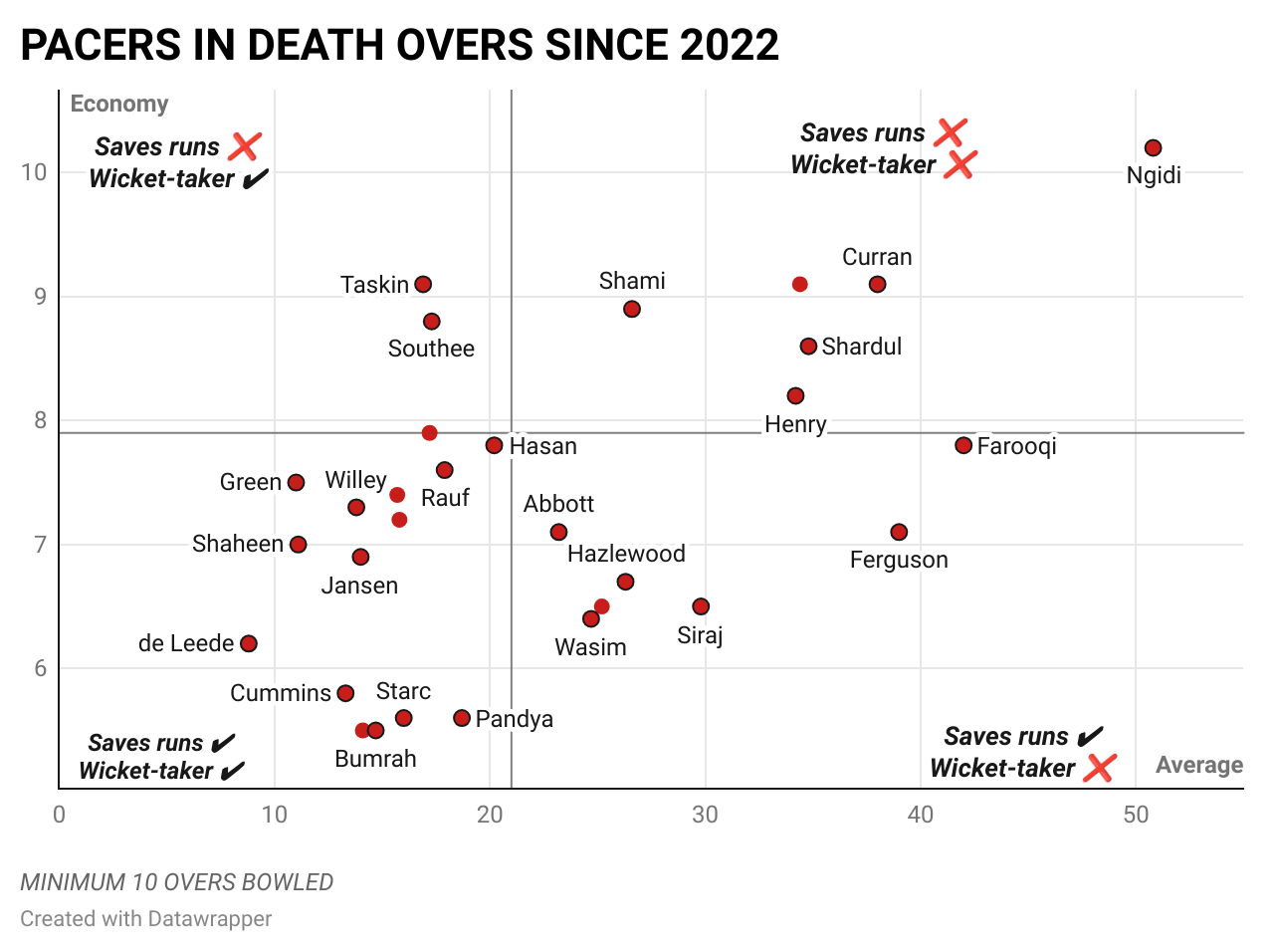 Shaheen and Rauf, in the same quadrant, tell you about the quality of Pakistan in this regard. Lungi Ngidi has bowled most overs for South Africa at the death and will need to improve his numbers for the Proteas to breathe easy. Surprisingly, Willey emerges as the best death-over option for England.