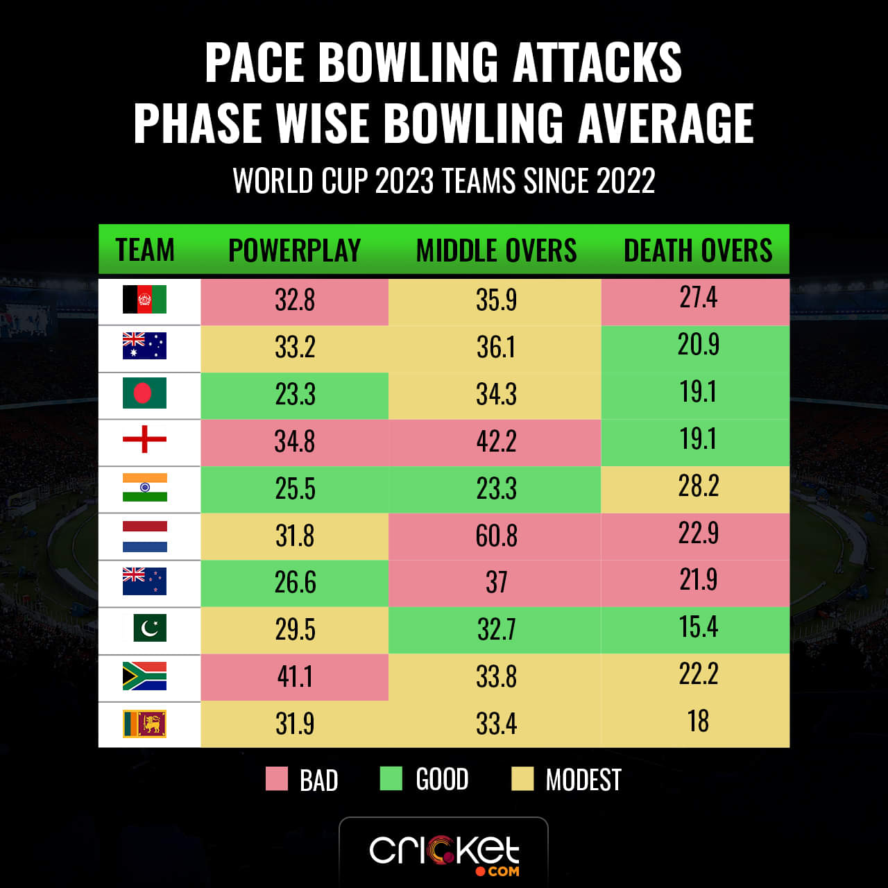 The three Asian sides, India, Pakistan and Bangladesh, are the best pace attacks, securing two green phases alongside one phase with moderate returns. Interestingly, they are green in different phases to each other.