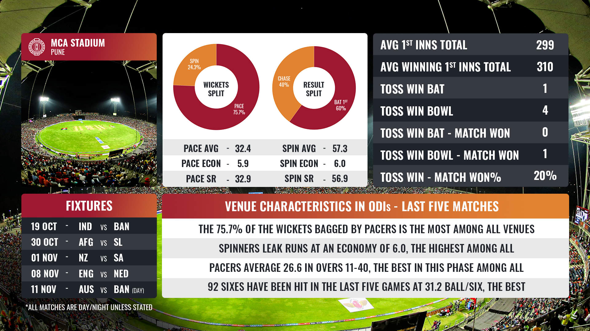 The Maharashtra Cricket Association Stadium has been a deathbed for spinners in the 50-over format. In three ODIs since 2021, the spinners here have an average of 109.7 and a strike rate of 91, compared to 33.8 and 32.2 respectively of seamers. Overall as well, spinners here have an average of 57.7.