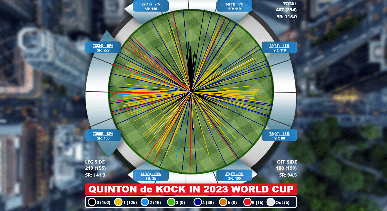 De Kock has been equally good against pace and spin, averaging close to 80 and striking at more than 100 against both bowling types. Furthermore, he has a strike rate of 112.4 on deliveries pitched on good length against fast bowlers, and that talks about his capability of hitting good balls for boundaries. The opener has played almost all shots available in the book and scored runs all around the ground, as the below wagon wheel reflects.