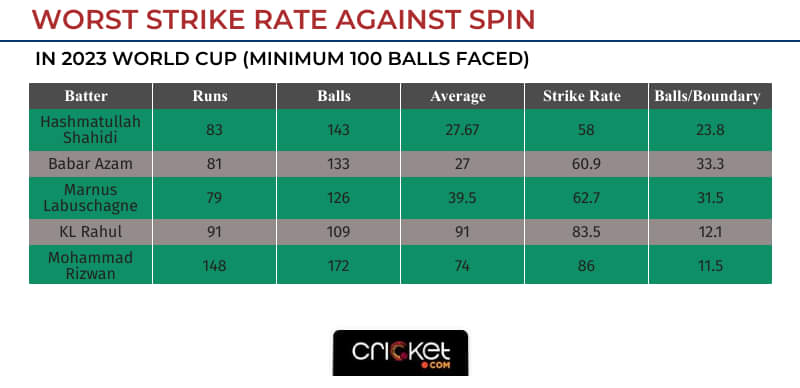 Babar has got out to spin three times in this World Cup, and the opponents have had little trouble planning against him. If you want to know how dismal those numbers are, Babar has the second-worst strike rate and worst balls/boundary (33.3) against spin in this World Cup - a minimum of 100 balls faced.