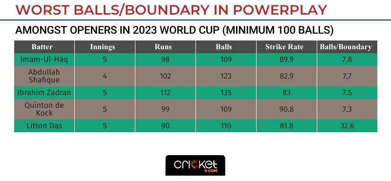 Amongst openers who have faced at least 100 deliveries in the powerplay, Imam (7.8) and Shafique (7.7) have the worst balls/boundary ratio. Not once have Pakistan touched the 60-run mark in the powerplay in this event. The two haven’t set the stage on fire, but they are still not Pakistan’s biggest worry.