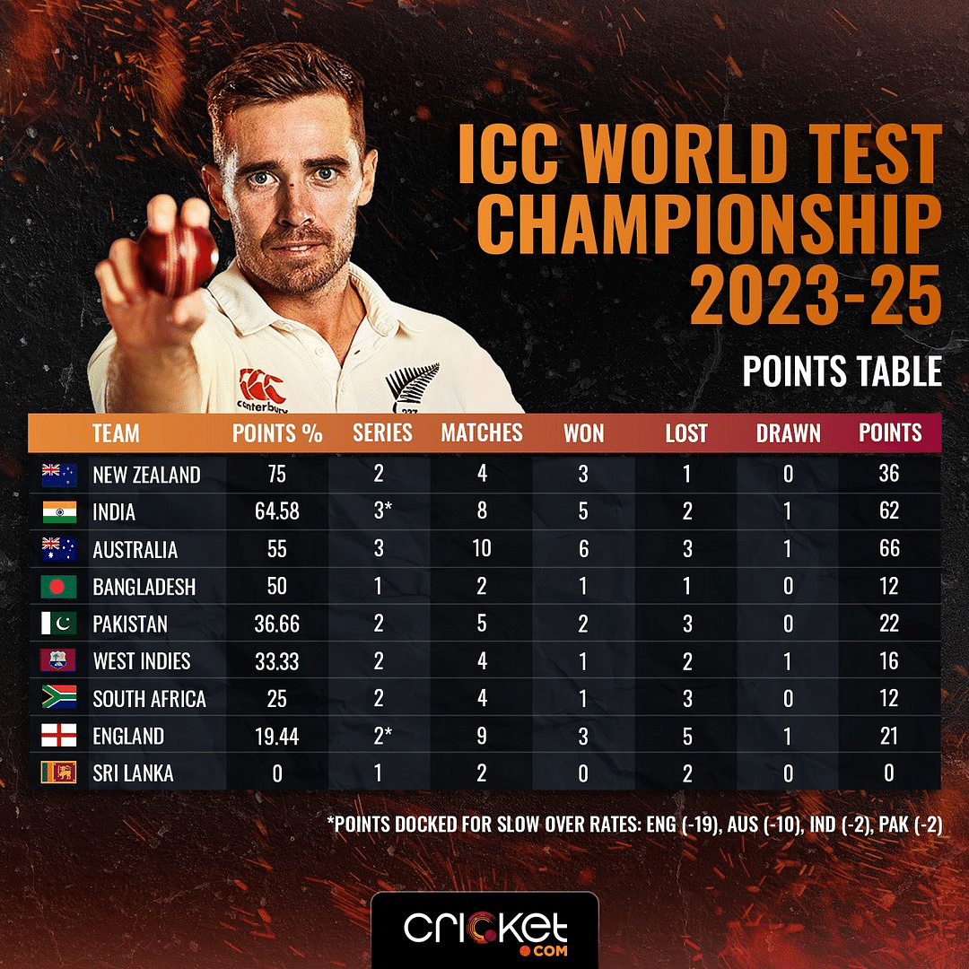 Australia's title defense started with two wins in the 2023 Ashes. However, they suffered a loss followed by a draw and another loss. Adding to their agony, they were docked ten points for slow over-rate in the Manchester Test. This is why, despite having six wins and one draw, their points received are 66 rather than 76.