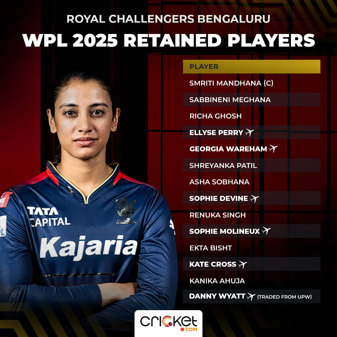 Players Retained: Smriti Mandhana (c), Sabbineni Meghana, Richa Ghosh (wk), Ellyse Perry*, Georgia Wareham*, Shreyanka Patil, Asha Sobhana, Sophie Devine*, Renuka Singh, Sophie Molineux*, Ekta Bisht, Kate Cross*, Kanika Ahuja, Danni Wyatt* (Traded from UPW)