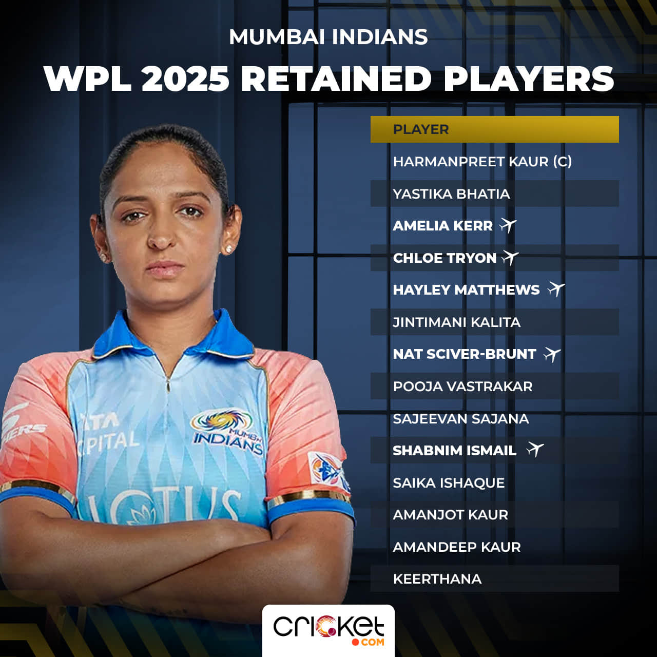Players retained: Harmanpreet Kaur (c), Yastika Bhatia (wk), Amelia Kerr*, Chloe Tryon*, Hayley Matthews*, Jintimani Kalita, Nat Sciver-Brunt*, Pooja Vastrakar, Sajeevan Sajana, Shabnim Ismail*, Saika Ishaque, Amanjot Kaur, Amandeep Kaur, Keerthana