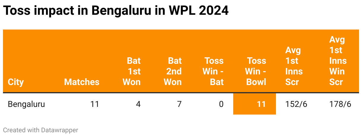 During the 2024 season, captains who won the toss chose to bowl in all the 11 games. Seven of those games saw teams chasing winning. The average first innings score was around 152 and the average first innings winning score was 178.