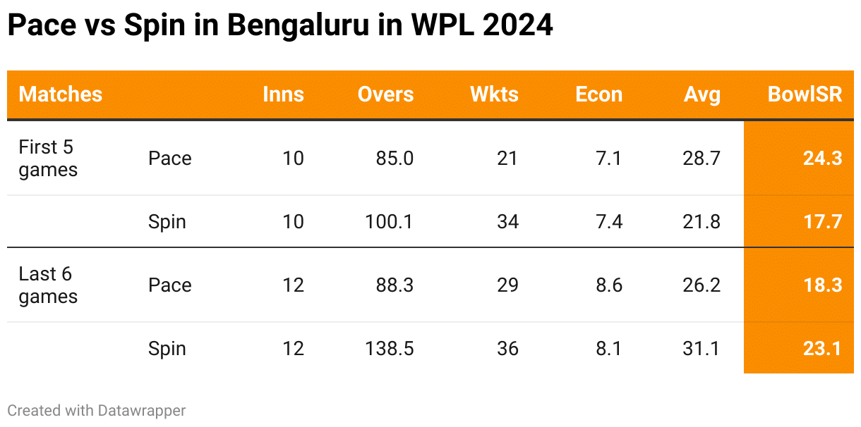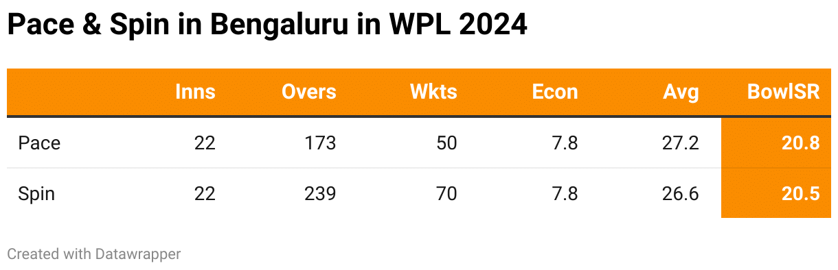 During the previous WPL season, spinners dominated, taking almost 60% of the wickets. The pacers might have taken less wickets, but they averaged and struck at a similar rate of the spinners bowling less overs.